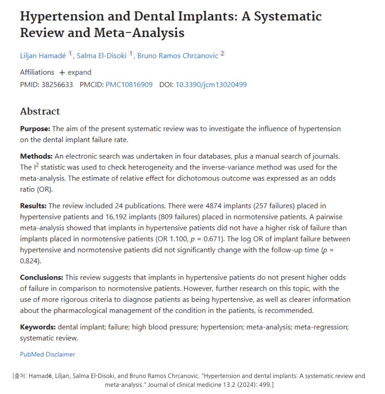 혈압이 안정적으로 조절되는 환자의 임플란트 성공률은건강한 사람과 거의 동일합니다.(출처: J Clin Med. 2024;13(2):499)